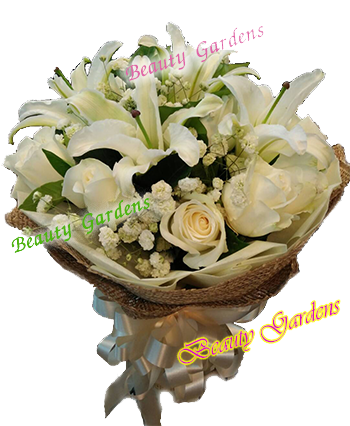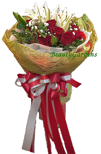 ช่อดอกไม้ ลิลลี่ขาว กุหลาบแดง ยิปโซ |